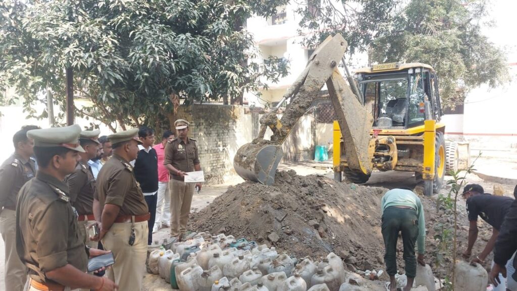 महराजगंज जनपद के पुलिश अधीक्षक सोमेन्द्र मीणा द्वारा नशीले पदार्थ के निस्तारण हेतु चलाये जा रहे अनुपालन एवम अपर पुलिश अधीक्षक आतिश कुमार सिंह के निर्देशन व क्षेत्राधिकारी आभा सिंह के पर्यवेक्षण व थानाध्यक्ष अभिषेक सिंह के नेतृत्व में आबकारी अधिनियम के तहत वर्ष 2023 – 24 में जब्त अबैद्य कच्ची शराब व देशी शराब के विनिष्टिकरण हेतु प्रेषित रिपोर्ट के आधार पर माननिय न्यायालय मुख्य न्यायिक मजिस्ट्रेट महराजगंज द्वारा दिनांक 18 / 02/ 2024 के द्वारा निर्गत आदेश के अनुपालन में आज दिनांक 20- 02 – 2024को तहसीलदार सदर पंकज शाही व नायब तहसीलदार विवेक श्रीवास्तव के मौजूदगी में थाना श्यामदेउरवा पर वर्ष 2023 – 24 में आबकारी अधिनियम के दाखिला कुल 90 मालो में बरामद 1250 लीटर अबैद्य कच्ची शराब व 271 पीस बंटी बबली को थाना परिषर में जे सी बी मशीन से गड्ढा खोदकर नियमानुसार माननिय न्यायालय के आदेस के अनुपालन में समस्त माल के विनिष्टिकरण की कार्यवाही की गयी