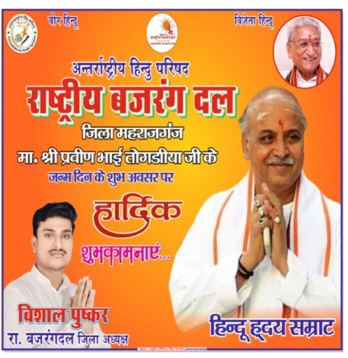 महराजगंज हिंदू परिषद राष्ट्रीय बजरंग दल संस्थापक हिंदू हृदय सम्राट प्रवीण भाई तोगड़िया जो के जन्मदिन के शुभ अवसर पर राष्ट्रीय बजरंग दल के जिला अध्यक्ष विशाल पुष्कर के नेतृत्व में इनके lजन्मदिन को धूमधाम से मनाया गया जिला अध्यक्ष विशाल पुष्कर ने कहा कि प्रवीण तोगड़िया केवल नाम नहीं करोड़ों दिलों की धड़कन है विशाल पुष्कर ने कहा कि भगवान राम इन्हें हमेशा स्वस्थ रखें ताकि देश भर में फैले लाखों करोड़ कार्यकर्ता को इनका मार्गदर्शन हमेशा मिलता रहे