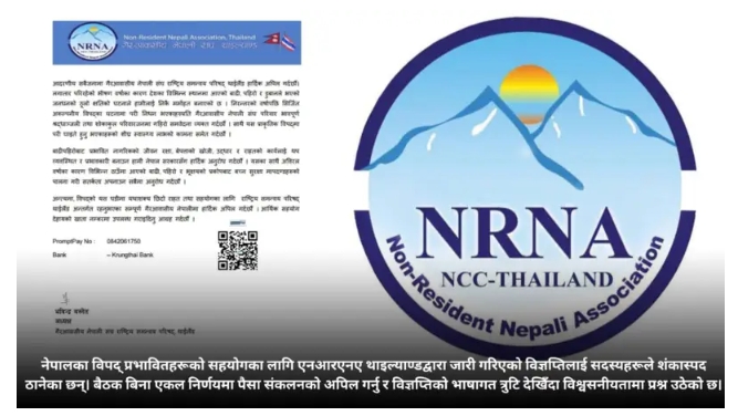 बयान में लिखा है, अनिवासी नेपाली एसोसिएशन राष्ट्रीय समन्वय परिषद थाईलैंड। जो मेल नहीं खाता ।