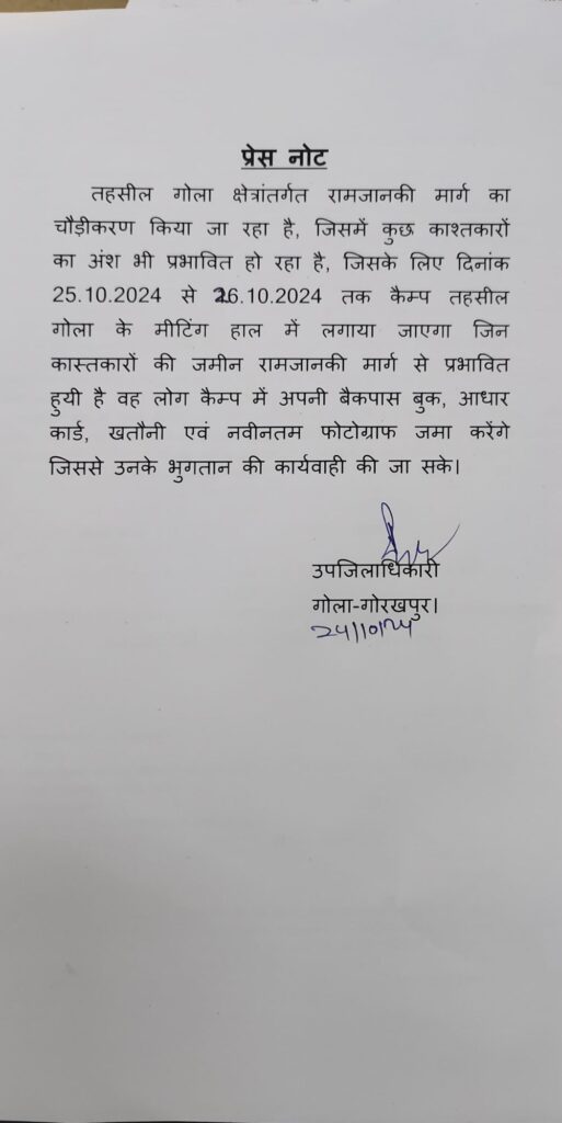 गोरखपुर। गोला तहसील के अंतर्गत चल रहे रामजानकी मार्ग का चौड़ीकरण के निर्माण में प्रभावित हो रही काश्तकारों के जमीन को लेकर आज से तहसील सभागार में कैंप का आयोजन किया जा रहा है। जिसकी जानकारी उपजिलाधिकारी गोला राजु कुमार ने प्रेस नोट के माध्यम दी है। उन्होंने प्रेस नोट के माध्यम से सूचित किया कि मार्ग के चौड़ीकरण में कुछ काश्तकारों के अंश प्रभावित हुए हैं। जिसके लिए 25 अक्टूबर दिन शुक्रवार से 26 अक्टूबर दिन शनिवार तक दो दिवसीय कैंप का आयोजन किया गया है। कैंप में काश्तकार अपनी बैंक पासबुक आधार कार्ड खतौनी और नवीनतम फोटोग्राफ जमा करेंगे जिससे उनके भुगतान की कार्यवाही की जा सकेगी।