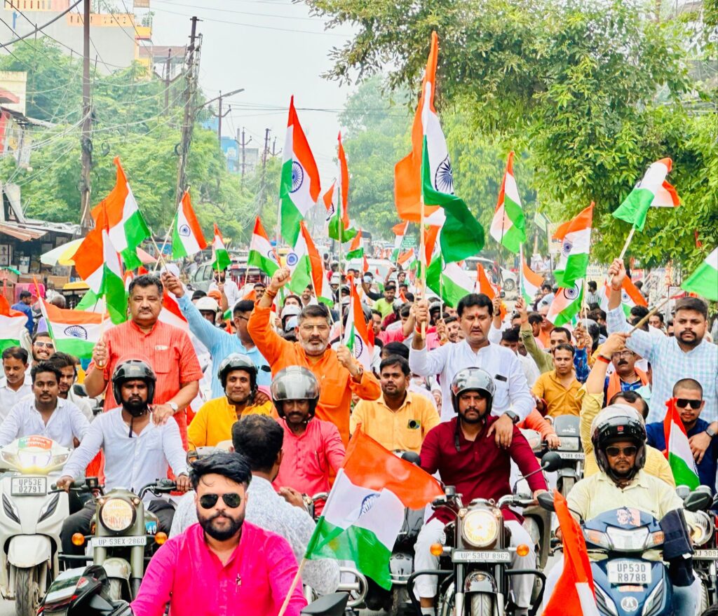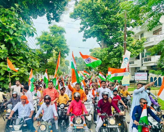 तिरंगे झंडे के साथ सैकड़ो की संख्या में बाइक रैली निकाली गई तिरंगा यात्रा में कार्यकर्ताओं ने भारत माता की जय नारा लगाते हुए भ्रमण किया।
