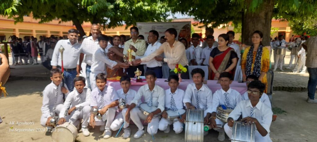 महराजगंज:- उत्तर प्रदेश समग्र शिक्षा अभियान तथा जिला विद्यालय निरीक्षक प्रदीप कुमार शर्मा के निर्देश के अनुपालन के क्रम में जनपद स्तरीय स्कूल बैण्ड प्रतियोगिता का आयोजन दिग्विजयनाथ इंटरमीडिएट कॉलेज चौक बाजार में संपन्न हुआ। इस प्रतियोगिता में जनपद के 6 टीमों ने प्रतिभाग किया जिसमें जवाहर नवोदय विद्यालय पैरामाउंट एकेडमी पंडित दीनदयाल इंटर कॉलेज की बालक टीम दिग्विजयनाथ इंटर कॉलेज की बालक और बालिका टीम तथा दिग्विजयनाथ बालिका इंटर कॉलेज की टीम ने प्रतिभाग किया। जनपद के बैण्ड नोडल अधिकारी डॉ. राकेश कुमार तिवारी ने बताया कि इस प्रतियोगिता में 10 से 15 मिनट तक प्रत्येक टीम ने बैण्ड बजाते हुए बेहतरीन प्रदर्शन किया।जिसमें बालक वर्ग में जवाहर नवोदय विद्यालय की टीम तथा बालिका वर्ग में दिग्विजयनाथ बालिका इंटर कॉलेज की टीम प्रथम स्थान पर रही। निर्णायक के रूप में लेफ्टिनेंट डॉ. रामपाल यादव एवं डॉ मनीषा त्रिपाठी रही ।कार्यक्रम का आरंभ मां सरस्वती के चित्र के सम्मुख पुष्पांजलि हुआ । प्रतियोगिता को संबोधित करते हुए विद्यालय के प्रधानाचार्य डॉ. हरिन्द्र यादव ने कहा कि जनपद प्रत्येक स्तर से आगे बढ़ रहा है। हर क्षेत्र में पूरे प्रदेश में अपना नाम रोशन कर रहा है। निश्चित ही बैंड प्रतियोगिता के क्षेत्र में जनपद एक मिसाल कायम करेगा। कार्यक्रम में जवाहर नवोदय विद्यालय के अमिताभ सिंह चंद्रनायक पंडित दीनदयाल इंटर कॉलेज के रामटहल प्रजापति पैरामाउंट एकेडमी के रूद्रेश मणि पटेल अभिषेक कुमार शुक्ल दिग्विजयनाथ के डॉ पंकज कुमार गुप्त दिग्विजयनाथ बालिका इंटर कॉलेज की प्रतिभा पांडेय एवं सरिता देवी सहित विद्यालय के बेस्ट प्रवक्ता जगदंबिका सिंह लेफ्टिनेंट शेषनाथ आशुतोष कुमार अखिलेश कुमार लेफ्टिनेंट तुलसी प्रसाद विनोद कुमार विमल सुनील कुमार राम सुखी यादव अक्षय कुमार अग्निहोत्री के साथ छात्र-छात्राएं उपस्थिति रहे।