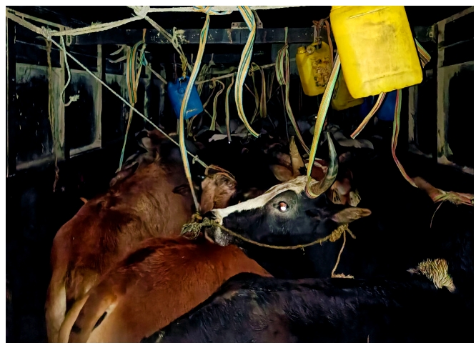 इन बैलों को उनकी पूँछों को ट्रक की छत पर बाँधकर और उनकी नाकों को रस्सी से छेद कर खून बहाकर ले जाया जाता पाया गया।