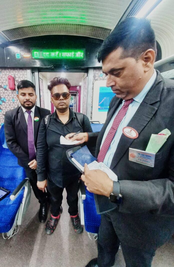ट्रेन संख्या 22550 वंदे भारत ट्रेन के C 3 एसी कोच में सफर कर रहे बीना टिकट के एक यात्री को *ट्रेन सुपरिंटेंडेंट श्री टी एन पांडेय गोरखपुर वेस्ट* आज बुधवार को प्रयागराज रायबरेली के बीच में टिकट चेक करने पहुंचे तो टिकट नहीं दिखा सके। इसके बदले पार्टी और जेडआरयूसीसी का मेंबर बताकर धौंस जमाने लगे।