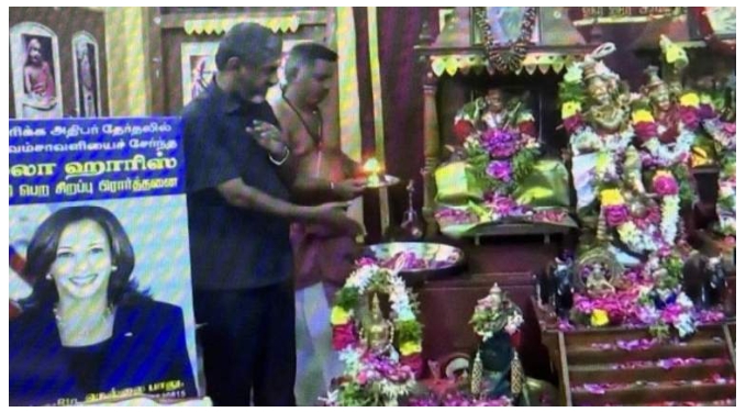 वीडियो में, हैरिस के चेहरे वाले बैनरों को हिंदू देवताओं की मूर्तियों के बगल में पुजारियों द्वारा पूजा करते देखा जा सकता है।
