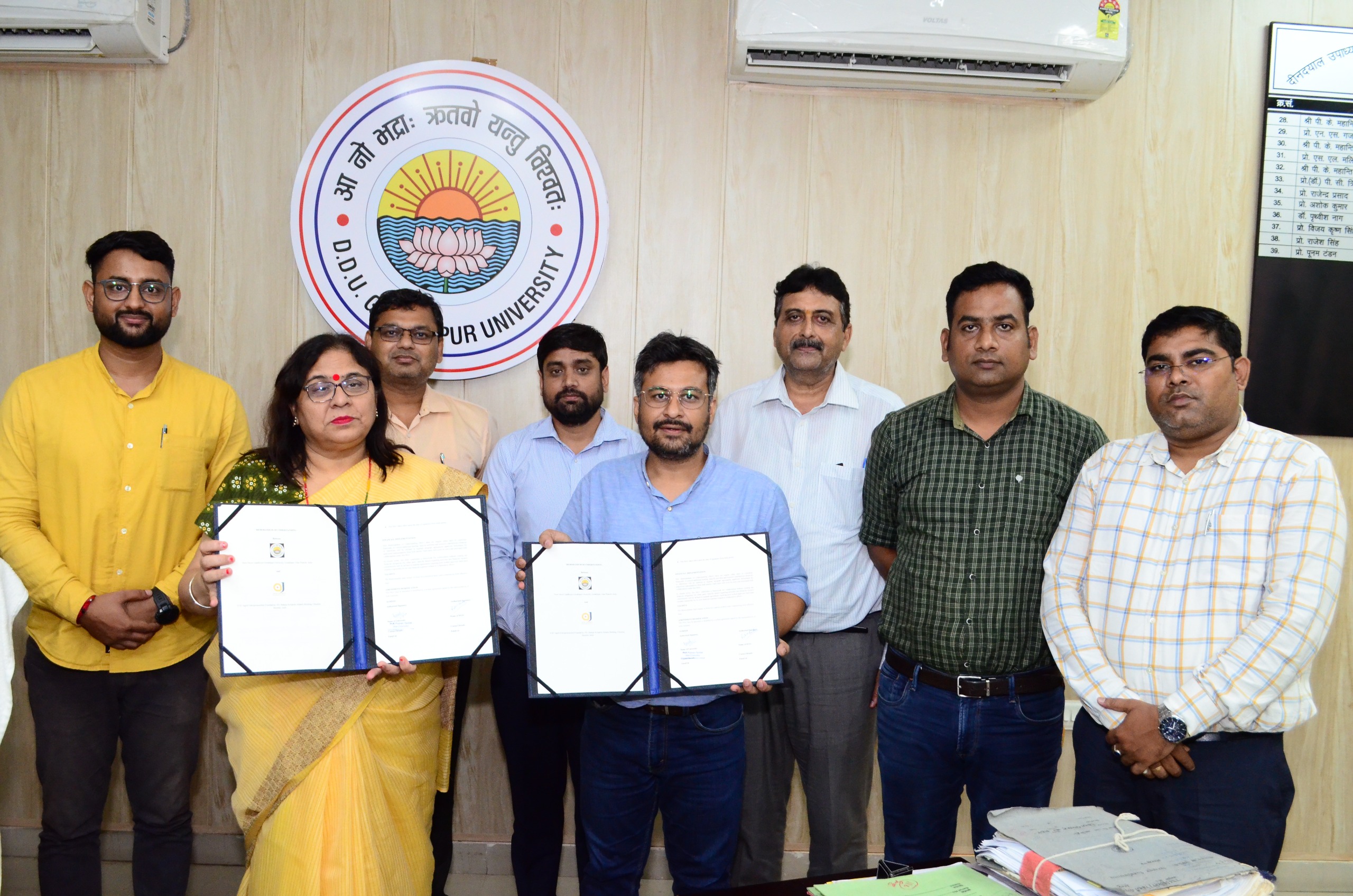 गोरखपुर। दीन दयाल उपाध्याय गोरखपुर विश्वविद्यालय एवम् ए सी आई सी जागृति उद्यमिता फाउंडेशन के बीच समझौता ज्ञापन करार हुआ जिसमे अनेक तथ्यों पर ध्यान दिया गया। विद्यार्थियों की शिक्षा को ध्यान में रखते हुए सामाजिक समस्याओं के समाधान के लिए नवोन्मेषी प्रशिक्षण कार्यक्रमों की योजना बनाने पर चर्चा की गयी , महत्वाकांक्षी युवा उद्यमियों को सहायता और संसाधन प्रदान करके एक मजबूत स्थानीय उद्यमशीलता पारिस्थितिकी तंत्र के निर्माण में योगदान कैसे दे सकती है, व्यवसाय , स्टार्टअप, स्थानीय व्यापार स्टार्टअप की जागरूकता और विकास के क्षेत्र में सहयोगात्मक प्रयास , साझा क्षेत्रों में जागरूकता अभियानों और पहलों का संयुक्त विकास आदि विषयों पर समझौता करार किया गया । इस कार्यक्रम मे कुलपति प्रो. पूनम टंडन , प्रो. वर्धन पाठक , प्रो. मनीष कुमार श्रीवास्तव , डॉ अंशु गुप्ता , डॉ मनीष कुमार और जागृति फाउंडेशन के अधिकारी सीईओ विश्वाश पांडेय, सूर्यवंशी राय, अभिषेक भरद्वाज आदि लोग आदि लोग उपस्थित रहे।