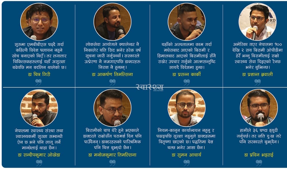 उन्होंने कुछ समय पहले स्वास्थ्य खबर द्वारा डॉक्टरों के साथ आयोजित एक इंटरैक्टिव कार्यक्रम में अपनी निराशा व्यक्त की थी. उनकी तरह, भाग लेने वाले अधिकांश डॉक्टरों ने शिकायत की कि नेपाल में स्वास्थ्य कर्मियों के लिए सुरक्षा और सुविधाओं दोनों का अभाव है। मैं कैलाली का रहने वाला व्यक्ति हूं. वहां से आ रहे मामलों को देखकर लगता है कि इसे वहीं पर मैनेज किया जाना चाहिए. लेकिन ऐसा नहीं है. डॉक्टर वहां इलाज में आने वाली चुनौतियों से घबराए हुए हैं। और सामान्य मरीजों को भी राजधानी रेफर किया जा रहा है.”