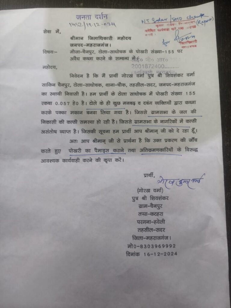 महराजगंज। सदर तहसील क्षेत्र के अंतर्गत गोरख वर्मा पुत्र शिवशंकर वर्मा साकिन चैनपुरटोला-साधोचक, थाना-चौक, तहसील सदर, जनपद-महराजगंज का स्थायी निवासी है। प्रार्थी के टोला साधोचक में पोखरी संख्या 155 रकबा 0.057 हे0 है। टोले के ही कुछ मनबढ़ व दबंग व्यक्तियों द्वारा कब्जा करके पक्का मकान बनवा लिया गया है। जिससे ग्रामसभा के जल की निकासी की काफी समस्या हो रही है। जिससे ग्रामसभा के नागरिकों में काफी असंतोष व्याप्त है। जिसकी सूचना प्रार्थी ने जिला अधिकारी प्रार्थना को दिया।