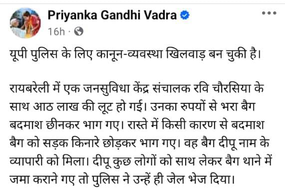 यूपी की कानून व्यवस्था खिलवाड़ बनी-प्रियंका गांधी