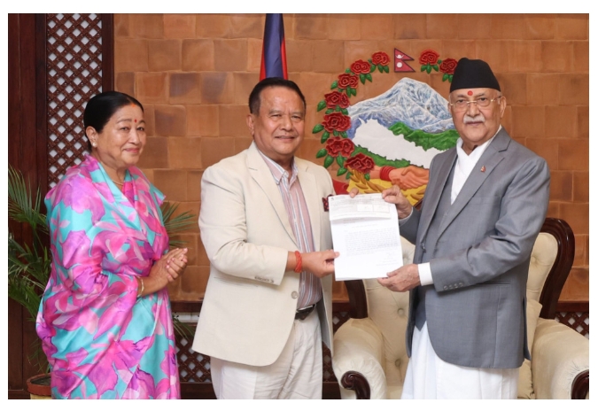 भाटभटेनी सुपरमार्केट के अध्यक्ष मीन बहादुर गुरुंग प्रधानमंत्री केपी शर्मा ओली को राहत चेक सौंपते हुए।