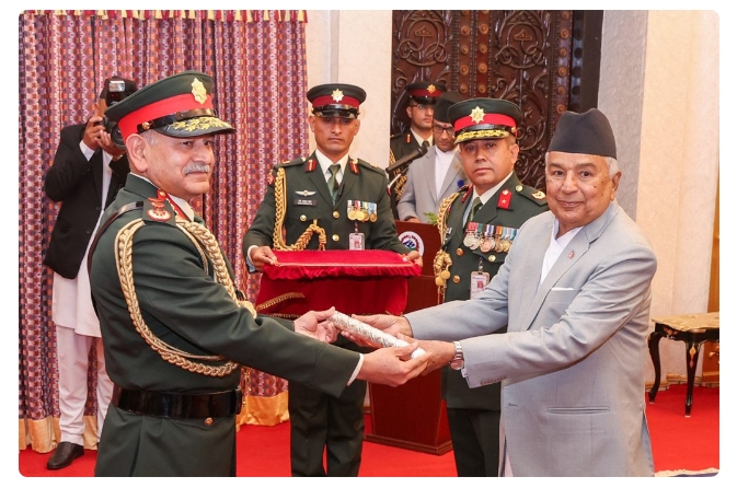 काठमाण्डौ,नेपाल – राष्ट्रपति रामचन्द्र पौडेल ने भारतीय सेना प्रमुख उपेन्द्र द्विवेदी को नेपाली सेना के मानद महारथी सम्मान से सम्मानित किया।