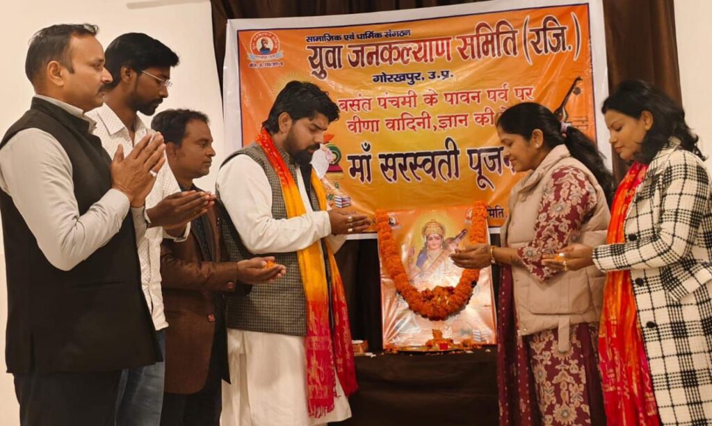 गोरखपुर – वसंत पंचमी के पावन पर्व पर दिनांक 3 फरवरी दिन सोमवार को सामाजिक व धार्मिक संगठन युवा जनकल्याण समिति के संस्थापक व संरक्षक ज्योतिषाचार्य पण्डित बृजेश पाण्डेय के आदेशानुसार संगठन के जिला कार्यालय रामजानकी नगर इण्डियन एकेडमी स्कूल मे माँ सरस्वती जी का पूजन उत्सव मनाया गया।
