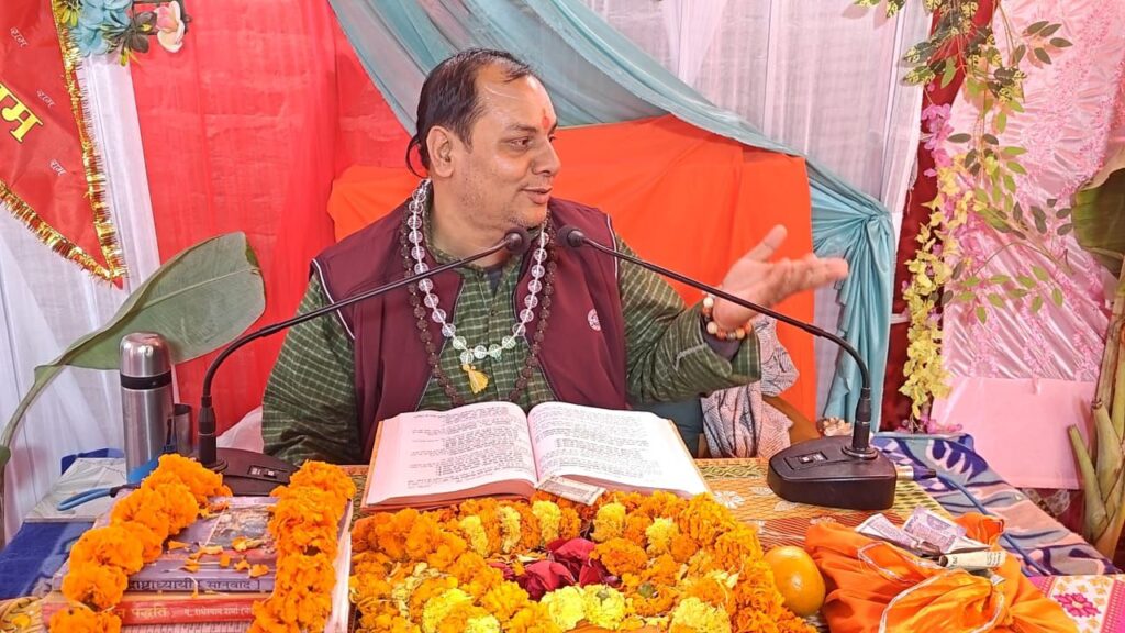 महराजगंज सदर विधायक प्रतिनिधि संजीव शुक्ला के आवास पर हो रहे श्रीमद्भागवत कथा में भारत सरकार के केंद्रीय वित्त राज्य मंत्री पंकज चौधरी ने बस पीठ की पूजा करने के उपरांत कहा कि कि सनातन धर्म रक्षा के लिए सभी का जागृत होना जरूरी है। सभी मांगलिक कार्य में माता-पिता का आशीर्वाद अत्यंत आवश्यक है। व्यास पीठाधीश्वर अंतरराष्ट्रीय कथा वाचक पंडित उपेन्द्र तिवारी ने केंद्रीय वित्त मंत्री पंकज चौधरी को माला पहना कर स्वागत किया। इस अवसर पर उन्होंने कहा कि भगवान कृष्ण के पैदा होने के बाद कंस उसको मौत के घाट उतारने के लिए अपनी राज्य की सर्वाधिक बलवान राक्षसी पूतना को भेजता है। पूतना वेश बदलकर भगवान श्रीकृष्ण को अपने स्तन से जहरीला दूध पिलाने का प्रयास करती है। लेकिन भगवान श्रीकृष्ण उसको मौत के घाट उतार देते हैं। उसके बाद कार्तिक माह में ब्रजवासी भगवान इंद्र को प्रसन्न करने के लिए पूजन का कार्यक्रम करने की तैयारी करते हैं। भगवान कृष्ण द्वारा उनको भगवान इंद्र की पूजन करने से मना करते हुए गोवर्धन महाराज की पूजन करने की बात कहते हैं। इंद्र भगवान उन बातों को सुनकर क्रोधित हो जाते हैं। वह अपने क्रोध से भारी वर्षा करते हैं। जिसको देखकर समस्त ब्रजवासी परेशान हो जाते हैं। भारी वर्षा को देख भगवान श्री कृष्ण गोवर्धन पर्वत को अपनी कनिष्ठा अंगुली पर उठाकर पूरे नगरवासियों को पर्वत को नीचे बुला लेते हैं। जिससे हार कर इंद्र एक सप्ताह के बाद वर्षा को बंद कर देते हैं। जिसके बाद ब्रज में भगवान श्री कृष्ण और गोवर्धन महाराज के जयकारे लगाने लगते हैं। मौके पर भगवान को छप्पन भोग लगाया गया। इस अवसर पर जिला अध्यक्ष संजय पांडेय, जिला उपाध्यक्ष संतोष सिंह, जितेंद्र पाल सिंह, जिला मंत्री आशुतोष शुक्ला,पूर्व नगर पालिका अध्यक्ष कृष्ण गोपाल जायसवाल, घुघली नगर पंचायत अध्यक्ष संतोष जायसवाल, अभिषेक पांडेय, राधेश्याम गुप्ता, जगदीश मिश्रा, मधुसूदन शुक्ला,राजीव शुक्ला, उमा शंकर शुक्ला, मंजू शुक्ला, मधु शुक्ला, पूनम देवी, मंजरी शुक्ला, पूजा शुक्ला, अर्चना त्रिपाठी, अर्पणा त्रिपाठी अमृता पांडेय सहित तमाम लोग मौजूद रहे।