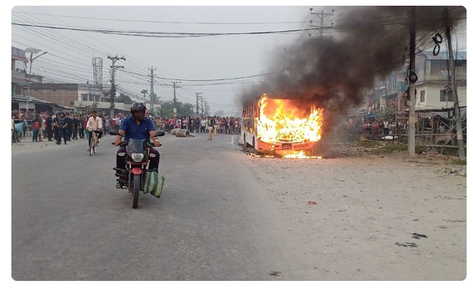कोशी राजमार्ग के खनार चौक पर सुनसारी-मोरंग सिंचाई परियोजना के पुल के पास दुर्घटना के बाद मौके से भाग रही बस में स्थानीय लोगों ने आग लगा दी। आग से बस पूरी तरह क्षतिग्रस्त हो गई।