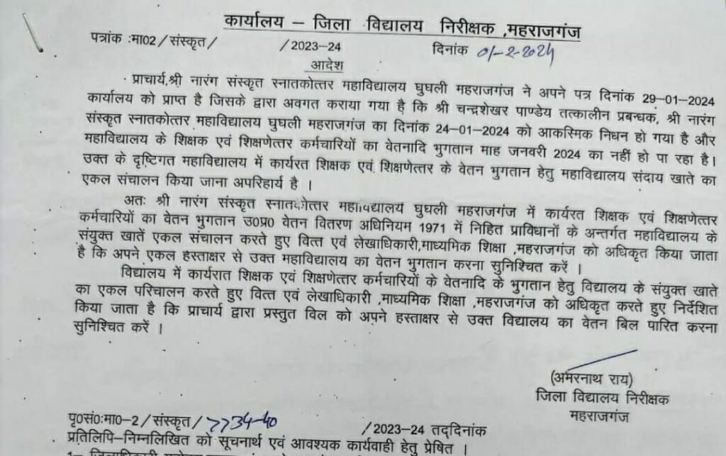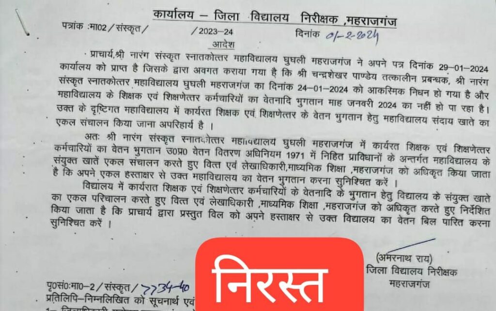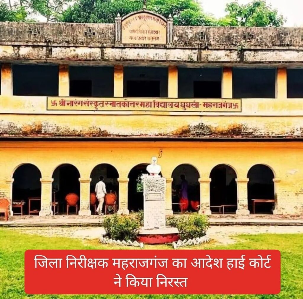 महराजगंज जनपद के नारंग संस्कृत महाविद्यालय, घुघली, धोखाधड़ी और अनियमितताओं के चंगुल में फंसा हुआ एक ऐसा संस्थान है, जहां विवादों की आग कभी बुझने का नाम ही नहीं लेती। चाहे फर्जी नियुक्तियाँ हों, नकली मार्कशीट तैयार करना हो, या प्रबंधन से जुड़ी जालसाजियाँ यह महाविद्यालय हमेशा किसी न किसी विवादो का केंद्र बना रहता है। हाल ही में एक और बड़ा विवाद सामने आया, जब 25 सितंबर 2024 को इलाहाबाद उच्च न्यायालय ने जिला विद्यालय निरीक्षक महाराजगंज द्वारा 1 फरवरी 2024 को जारी किए गए एकल संचालन के आदेश को अवैध करार देते हुए रद्द कर दिया। न्यायमूर्ति मनीष कुमार की अध्यक्षता में हुए इस सुनवाई में जिला विद्यालय निरीक्षक के आदेश को ‘प्राकृतिक न्याय के सिद्धांतों का उल्लंघन’ और ‘अधिकारों का दुरुपयोग’ बताया गया। अदालत ने यह स्पष्ट किया कि जिला विद्यालय निरीक्षक ने अपने अधिकारों से बाहर जाकर आदेश जारी किया था, जिससे महाविद्यालय में अनियमितताओं को बढ़ावा मिला।