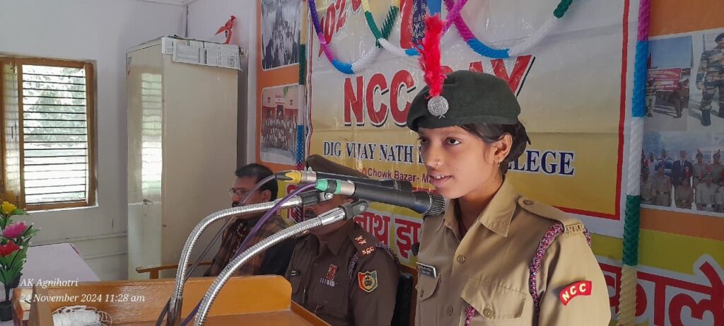 चौक बाजार महराजगंज दिग्विजयनाथ इंटरमीडिएट कॉलेज चौक बाजार, महराजगंज में आज दिनांक 24 नवंबर 2024 को 76 वां एनसीसी दिवस का आयोजन किया गया। सभी कैडेट्स ने मिलकर एनसीसी दिवस हर्षोल्लास पूर्वक मनाया । इस अवसर पर मुख्य अतिथि के रूप में शिव जपत सिंह इंटर कॉलेज भिटौली बाजार के शिक्षक गामा प्रसाद रहे । उन्होने अपने संबोधन में एनसीसी की महत्ता ,गुणवत्ता एवं उसके उद्देश्य तथा इसकी व्यापकता पर प्रकाश डाला। लेफ्टिनेंट शेषनाथ ने एनसीसी के योगदानों पर विस्तृत रूप से प्रकाश डाला तथा अंत में उन्होंने बताया कि एनसीसी के प्रति कैडेट को समर्पित रहने की आवश्यकता है ताकि भविष्य में आने वाली समस्याओं से विशेष रूप से सैनिक कार्यवाही में समाधान मिल सके। शिक्षक सूर्यप्रकाश गुप्त ने भी एनसीसी के योगदानों को तथा उससे मिलने वाले लाभों के विषय में कैडेट्स को बताया। इस अवसर पर विद्यालय के शिक्षक, कर्मचारी गण तथा कैडेट्स उपस्थित रहे।