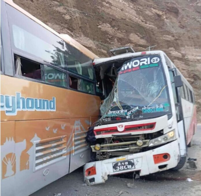 रतन गुप्ता उप संपादक -रविवार दोपहर नेपाल के पृथ्वी राजमार्ग के अंतर्गत बांदीपुर ग्रामीण नगर पालिका-5 नयापुल गोरेचौतारा में दो बसों की टक्कर में 29 यात्री घायल हो गए।जिला पुलिस कार्यालय तनाहुन के पुलिस उपाधीक्षक अशोक थापा ने बताया कि गंडकी जेएए 0070 नंबर की बस और 1K 3487 नंबर की बस आपस में टकरा गई, जिससे 29 लोग घायल हो गए। उनके मुताबिक घायलों में तीन की हालत गंभीर है.मुगलिन पोखरा सड़क योजना के दर्जनों की मदद से बस में फंसे यात्रियों को बाहर निकाला गया. प्रणौ थापा ने कहा, फिलहाल घायलों को डुमरे के लक्ष्मी अस्पताल भेजा गया है और गंभीर रूप से बीमार लोगों को चितवन भेजा गया है।