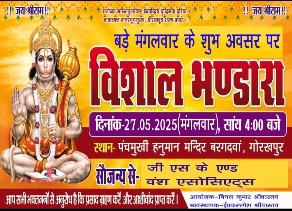 गोरखपुर – बड़े मंगलवार के शुभ अवसर पर बरगदवा स्थित श्री श्री 108 झपाली हनुमान गढ़ी मंदिर पर जेष्ठ मास के तीसरे मंगलवार को विशाल भंडारे का आयोजन किया गया भंडारे में लगभग हजारों की संख्या में श्रद्धालुओं ने प्रसाद ग्रहण किया। इस भंडारे का आयोजन जीo एसo केo एवं वंश एसोसिएट के तत्वाधान में विनय कुमार श्रीवास्तव एवं ईo करुणेश श्रीवास्तव द्वारा किया गया। इस आयोजन को सफल बनाने हेतु आयोजन के सदस्यगण में अवधेश पांडेय राजन श्रीवास्तव, राजबली विश्वकर्मा, विजय शंकर श्रीवास्तव, ओoपीo श्रीवास्तव, विनोद सिंह यादव,सहित अन्य लोगों ने आयोजन को सफल बनाने हेतु अपना सहयोग प्रदान किया।