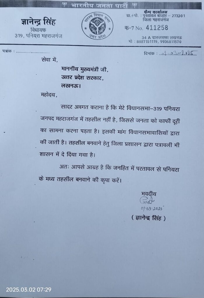 अवशेष भाग को बनवाने हेतु - जन मानस की समस्याओं को देखते हुए पनियरा विधानसभा क्षेत्र में जनहित में परतावल से पनियरा के मध्य तहसील बनवाने हेतु