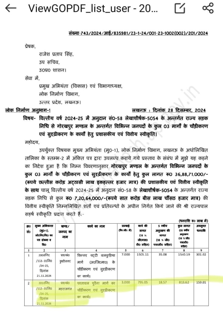 वित्तीय वर्ष 2024-25 में अनुदान सं0-58 लेखाशीर्षक-5054 के अन्तर्गत राज्य सड़क निधि से पनियरा विधानसभा क्षेत्र के लोकप्रिय विधायक ज्ञानेंद्र सिंह जी के प्रयास से “परतावल-पुरैना मार्ग” 3 किमी० का चौड़ीकरण एवं सुदृढ़ीकरण का कार्य के लिए 8 करोड़ 13 लाख 62 हजार रुपए धन स्वीकृत होने पर क्षेत्र वासियों में हर्षौल्लास।