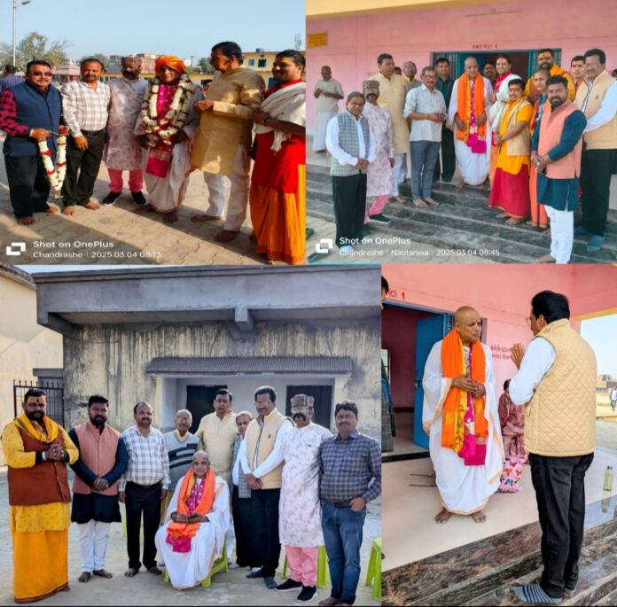 रतन गुप्ता उप संपादक—- आज श्रीतिरुपतिबालाजीमंदिरआंध्रप्रदेश के मुख्यपुजारी श्रीआनंदतीर्थआचार्य गुरु जी महाराज का भगवान श्री पशुपतिनाथ जी के दर्शन हेतु काठमांडू जाते समय रास्ते में नौतनवां स्थित श्री बनैलिया समय माता मंदिर में दर्शन पूजन हेतु भी आगमन हुआ, जहां मां श्री बनैलिया मंदिर विकास समिति के संरक्षक कौशल किशोर सिंह (मुन्ना सिंह) पूर्व विधायक एवं अध्यक्ष दयाराम जैसवाल, महामंत्री शिवकुमार शर्मा,कोषाध्यक्ष दुर्गा मद्धेशिया सहित हम सभी मंदिर विकास समिति के सदस्यों में प्रमुख रूप से व्यापार मंडल अध्यक्ष संतोष जैसवाल व जैसवाल समाज के अध्यक्ष श्री उमा जैसवाल+पूर्व अध्यक्ष श्री कृष्णमूरारी जैसवाल, बृजेंद्र श्रीवास्तव (मुख्य संरक्षक श्री चित्रगुप्त मंदिर सभा), मां बनैलिया मंदिर के पुजारी टीम सहित मुख्य पुजारी श्री जितेन्द्र बाबा , मैनेजर रिखीराम थापा, नागेन्द्र शुक्ला वकील, बलराम, चंद्रशेखर आदि अन्य सम्मानित लोगों ने भी उनका स्वागत अभिनंदन किया और महाराज जी का आशीर्वाद प्राप्त किया।