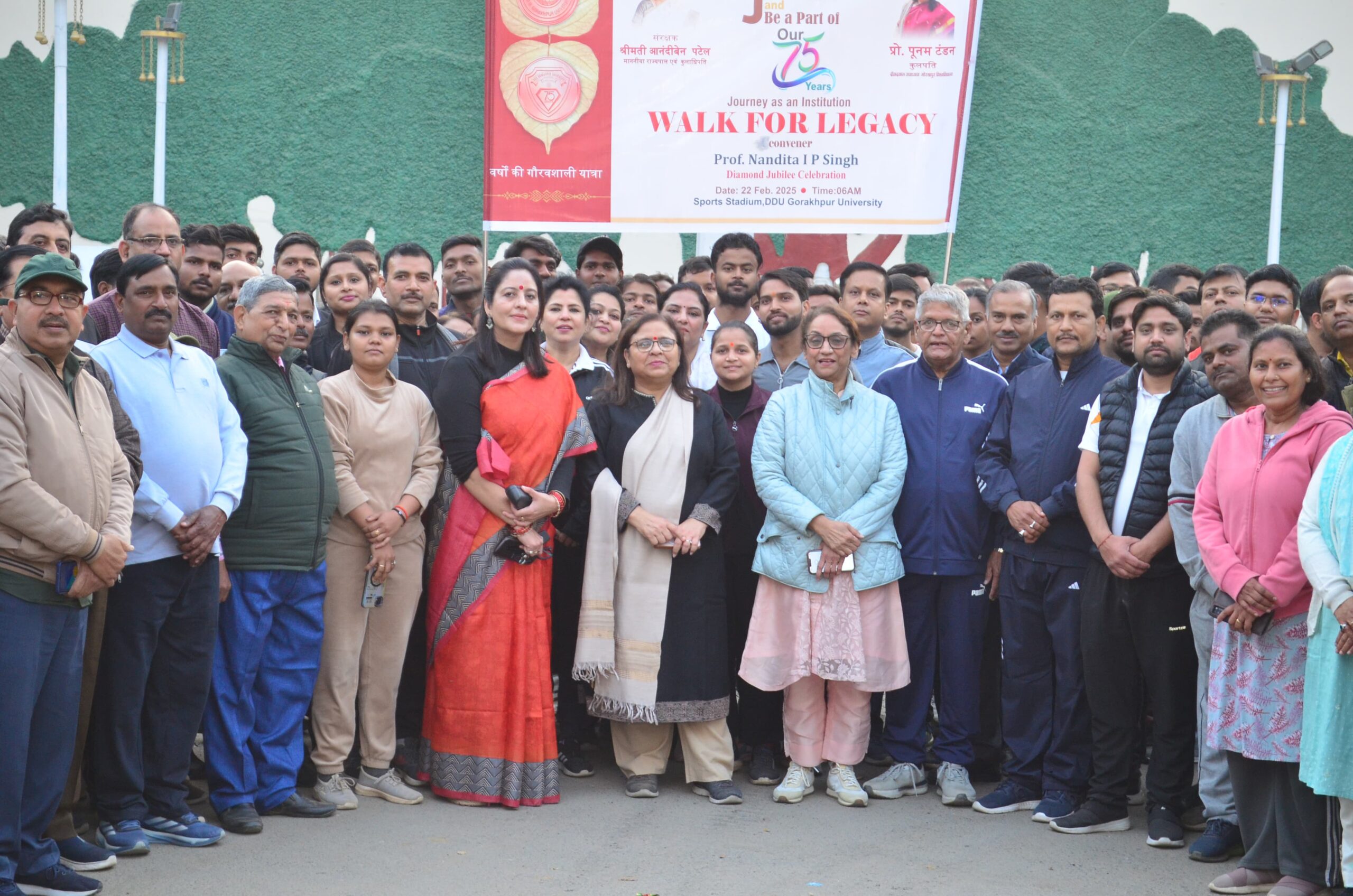 रिपोर्टर अर्चना पाण्डेय —- दीनदयाल उपाध्याय गोरखपुर विश्वविद्यालय में 22 फरवरी को प्रात 6 बजे में हीरक जयंती समारोह के अंतर्गत ‘वॉक फॉर लिगेसी’ का भव्य आयोजन किया गया। इस अवसर पर विश्वविद्यालय के शिक्षक, कर्मचारी, छात्र एवं छात्राएँ स्पोर्ट्स स्टेडियम में एकत्रित हुए। कार्यक्रम की शुरुआत विश्वविद्यालय के कुलगीत के सामूहिक गायन से हुई, जिससे पूरा परिसर उत्साह और गौरव से भर उठा।इस आयोजन की संयोजक प्रोफेसर नंदिता आई.पी. सिंह ने कहा कि इस प्रकार के नवाचार न केवल विश्वविद्यालय को जीवंत और ऊर्जावान बनाते हैं, बल्कि इसकी समृद्ध परंपरा को भी सुदृढ़ करते हैं। उन्होंने इस सफल आयोजन का श्रेय विश्वविद्यालय की कुलपति प्रोफेसर पूनम टंडन को दिया, जिनके कुशल नेतृत्व में यह कार्यक्रम संभव हो सका।कुलपति प्रोफेसर पूनम टंडन ने अपने संबोधन में कहा कि ‘वॉक फॉर लिगेसी’ जैसे आयोजन विश्वविद्यालय की गौरवशाली परंपरा को जनमानस तक पहुँचाने का सशक्त माध्यम हैं। उन्होंने विश्वविद्यालय परिवार को इस ऐतिहासिक यात्रा का हिस्सा बनने के लिए प्रेरित किया। इसके पश्चात्, यह पदयात्रा विश्वविद्यालय स्टेडियम से प्रारंभ होकर मुख्य द्वार, पंत पार्क होते हुए पुनः मुख्य द्वार पर समाप्त हुई, जहाँ सभी ने एक स्वर में राष्ट्रगान गाकर राष्ट्रप्रेम और एकता का संदेश दिया।इस आयोजन के माध्यम से विश्वविद्यालय परिवार ने 75 वर्षों की गौरवमयी यात्रा का उत्सव मनाया और शिक्षकों, कर्मचारियों एवं विद्यार्थियों ने विश्वविद्यालय के सतत विकास में योगदान देने का संकल्प लिया। इस ऐतिहासिक अवसर ने सभी को नई प्रेरणा, ऊर्जा और उत्साह से भर दिया।