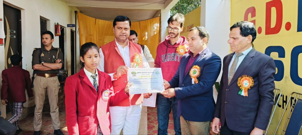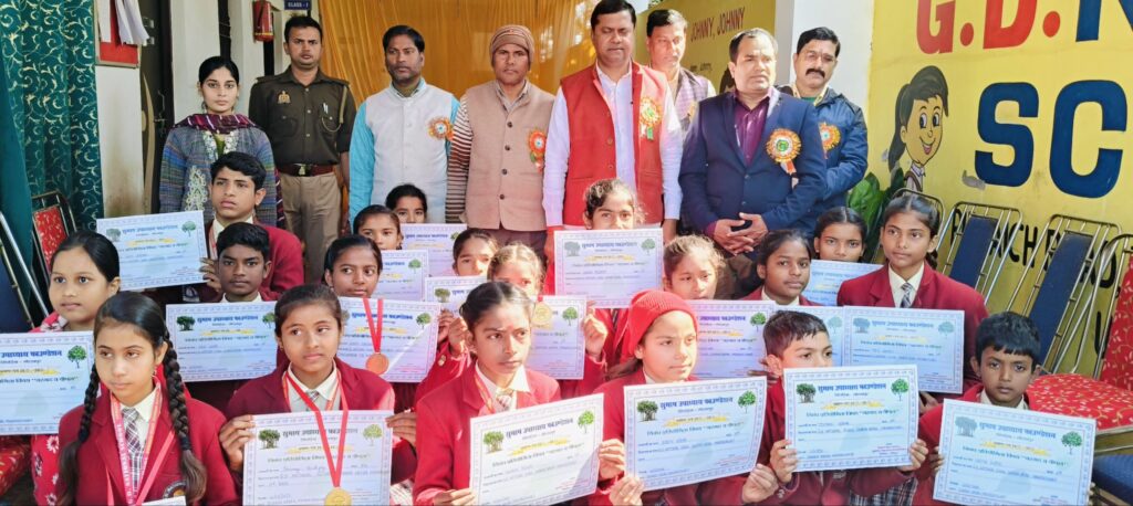 आज GD नेशनल स्कूल, धनहा नायक के परिसर में आयोजित “सुभाष उपाध्याय फाउंडेशन सिंघड़ियां, गोरखपुर” द्वारा किए गए निबंध प्रतियोगिता 2025- 26 के निम्मित विषय- बरगद व पीपल में प्रतिभाग करने वाले छात्र-छात्राओं के सम्मान समारोह में बतौर मुख्य अतिथि उपस्थित होकर विधायक पुत्र भाजपा नेता प्रेमशंकर उर्फ निर्भय सिंह ने छात्र छात्राओं को प्रमाण पत्र वितरण किया।